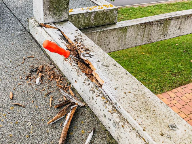 Grobspanplatten, die sogenannten OBS-Platten, halten auch mit Farbe bestrichen nicht auf Dauer jeder Witterung stand. Gleiches gilt für so manche Dachbalken, denen die richtige Lackierung fehlte, um vor Feuchtigkeit zu schützen.